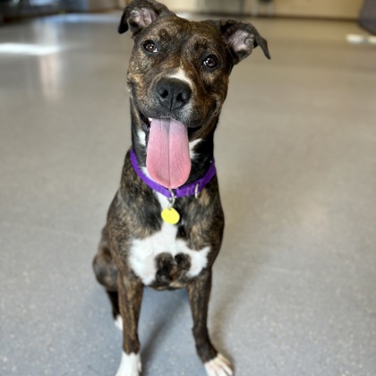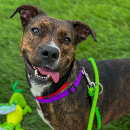 Meet Cleo, a beautiful, brindle pup with a heart of gold! Cleo is a playful and energetic dog who loves nothing more than playing with her favorite toys. Whether it's a squeaky ball or a plush chew toy, Cleo is always up for a game of fetch or tug-of-war.