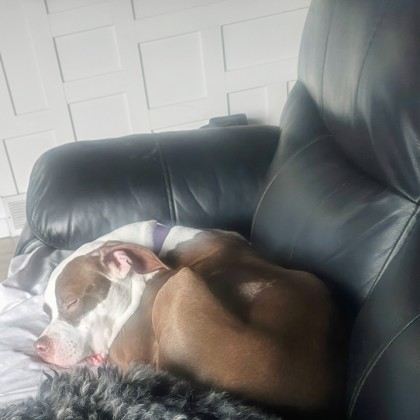 "Edalynn is an energetic friendly girl. In the foster home, she has gotten along with other dogs and loves people and children. She is doing very well on house training and crate training. She is very snuggly and enjoys being with her people."