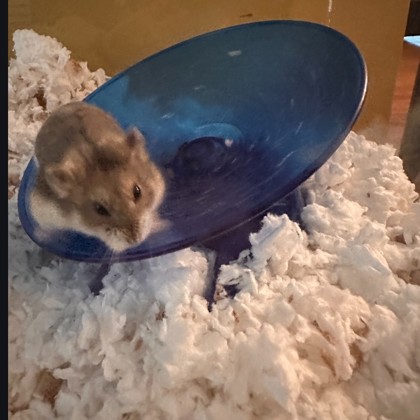 Elara is a 4 month old dwarf hamster. She loves to dig in lots of fluff, exercise on her wheel, carries all of her food under her fluff and munches on small bits of Timothy hay.