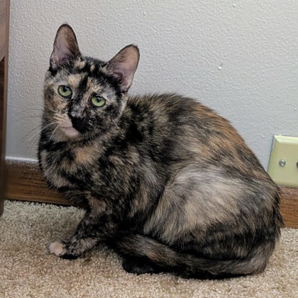 Jelly Bean is a shy sweetheart who is learning to trust. When people are around, she prefers to quietly observe from a cozy hiding spot, but recently she has started accepting treats and even enjoying gentle pets on her forehead, cheeks, and chin. She has offered some soft purrs (and maybe even a little happy drool - shh, don't tell her we noticed!).