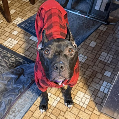 "Daisy is a sweet, cuddly gal, and a quick learner. She loves to hang out on the couch on her down times. She is playful (playing tug is a favorite and making toys squeak until they don't), but not super high energy. Daisy loves attention and can be talkative. She is house and crate trained and knows how to sit (we are working on other commands). Daisy loves her daily walks. She gets along with the resident cats. Overall, Daisy is super happy girl, and at times so happy she has what we call "happy tail."