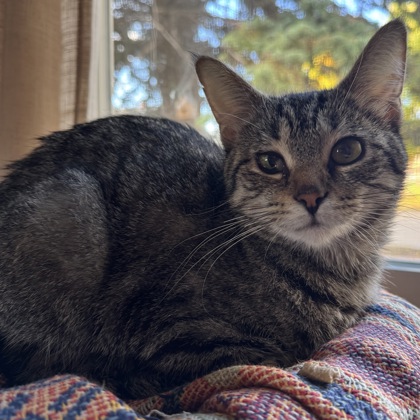 Kanga has the sweetest meow and loves to chat with her people. From the moment we met her, she was ready for some pets and affection. Kanga is definitely a ground-level kind of gal. She's happy to be held for a few minutes but she much prefers to stay low, lounging or exploring at her own pace. Kanga will chase her jingle balls, bat toys around and go after the feather wand. She likes to jump around when playing with her toys - it is pretty entertaining! She will scratch her scratching posts, curl up in the cat tower hidey holes and really likes perching to watch the wildlife outside. She is just over a year old and healthy overall. If you're looking for a good mix of calm, playful and lovey, Kanga could be your girl.