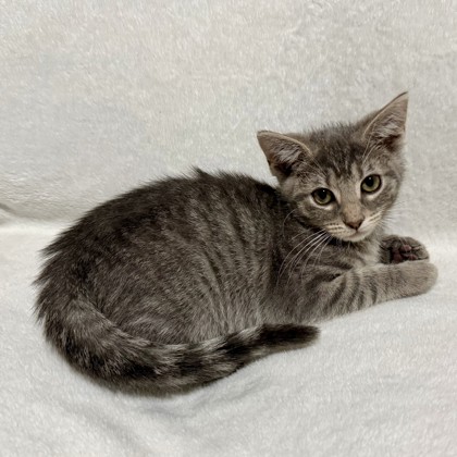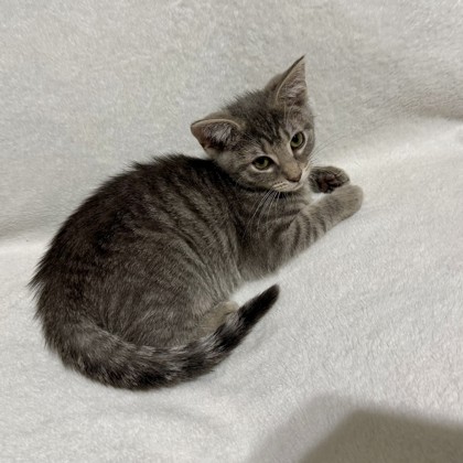 Fang's foster parent says Fang is a typical the "big brother" to his two sisters. In comparison to them, he stands tall and robust, exuding immense strength, solidity, and might. While he is a strong protector and hunter, he is also a huge lover and snuggler. The first to snuggle up in your lap, he purrs so softly that you almost forget his true nature as a "tiger". His prominent stripes make him appear almost like a real tiger. An energetic and playful companion, he flips around, chases toys, and wrestles with his sisters. If you would like to meet this mighty little boy, please contact his foster parent at Lovefurever5@gmail.com