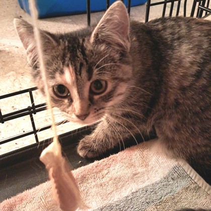 Wand toys beware! No toy gets past this playful kitten! Ham is starting to come out of her shell and explore the world. She loves batting balls, tearing around the room, and going on expeditions behind the furniture. She's happy to play with any human, young or old, who's willing to bring out the wand toy! If you're interested in meeting this pretty playmate, email me at familyfosters16@gmail.com.