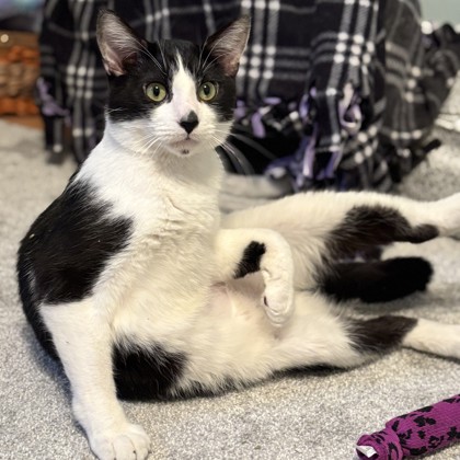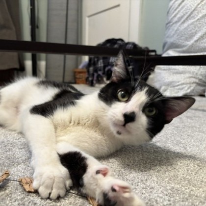 "Patches is a wonderful cat who will slowly open up to you. He loves to play with string and cardboard and is food motivated! After spending a few days with us he went from being a timid cat and hiding to coming out to play and getting lots of lots of pets & head boops."
