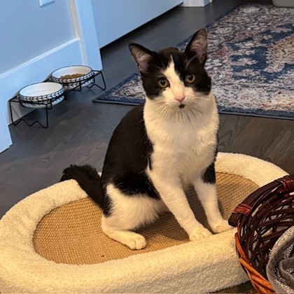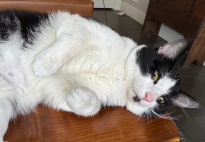 Popeye's foster parent says Popeyes is a gentle boy that greets you with rubs, kisses and meows.  He loves to be rubbed on his back and will quickly roll over so that you can rub his tummy.  When not playing with his toys, he loves to curl up in your lap.