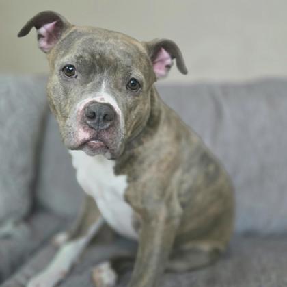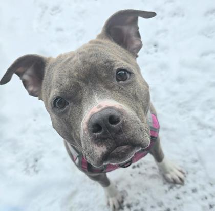 Description from the foster -This sweet pitty girl is an absolute joy to have in my foster home. She's affectionate, happy, and full of personality. She does have a mild limp in her back leg, which is most noticeable in cold weather, but it doesn't dampen her enthusiasm at all-she loves to run and gets adorably excited every time it's time to go outside.