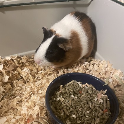 "Remy is very sweet girl. She is small and young but her squeaks are mighty! Her favorite treat is carrots, and she is very speedy at grabbing them and bringing them into her igloo!"