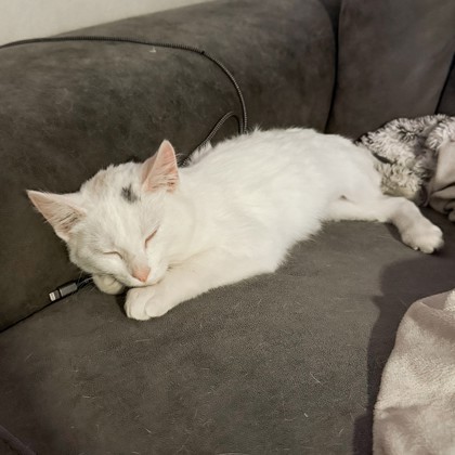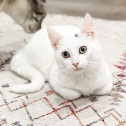 "Puff is the perfect example of a well behaved lady. She is pure white with the smallest black "moon" on her head. She uses the litter box like a lady. She is quiet and respectful but also enjoys chasing her tail in circles and playing with her toy balls. She came to us scared and timid and has come a long way. In our home, Puff is well socialized with kids and dogs and even cuddles with our resident cat. She is brave and playful. Puff can't wait to find her adoptive home!"