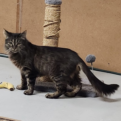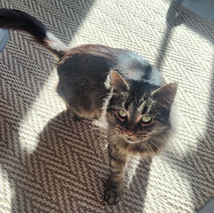 Seven year old Layla is such a lovely kitty! Her long coat, beautiful leg stripes, and outrageously long whiskers will steal your heart. Look at the cute markings on her mouth that look like a grin!