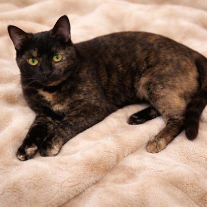 "Toffy is a loving, people-oriented young cat who bonds quickly. She enjoys play and affection, and because she can get excited during cuddle time, she does best with short petting sessions and play breaks. She enjoys interactive toys and is happiest when she can play, relax, and then play again. She will shine with an adopter who understands how to balance affection with calm."