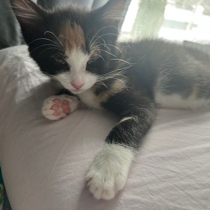 "Meet Noel, an energetic calico girl with a big personality packed into a tiny, tricolored package. She plays hard, throwing her whole heart into every game, whether she's squealing with delight while wrestling with her siblings or dramatically dangling from the cat tree like a fearless acrobat. Fish-flavored food is her favorite and she isn't shy about demanding your attention when she is ready for food or love. Noel adores batting around toy mice, chasing bits of cotton and especially playing with her sister Angel.