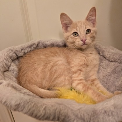 Meet Doughnut! Who doesn't love a sweet Doughnut! This little guy is funny. He loves to play and rolls around for pets. He is truly enjoying playing with every toy he can find. Doughnut loves to play hide and seek with his brother Muffin and he thinks he hides so well! LOL He is a beautiful buff color with white stripes mixed in and he has the more greenish eyes! He purrs loud, uses his box very well in our home and like all growing long legged boys he likes to eat! If you have any questions or would like to set up a meet and greet, please email me at kellybreville@gmail.com