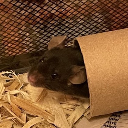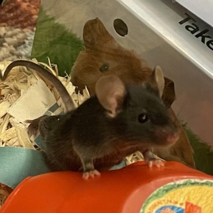 Dori's foster parent says Dori is one cute little mouse! She is curious and likes to run around on her wheel. She is also content to curl up in her igloo and nap.
