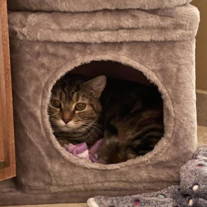 "Splinco is a cautious, but curious and sweet kitten. Her initial reaction is to hide and hiss, but by giving her the space and reassurance that she is safe with you, she becomes more comfortable with having others nearby. She has slowly become open to being pet and recently started to initiate engagement/interaction. She has enjoyed playing with her toys, both on her own and with people. Splinco has used her litter box consistently without any issues. Splinco has been eating and drinking water normally."