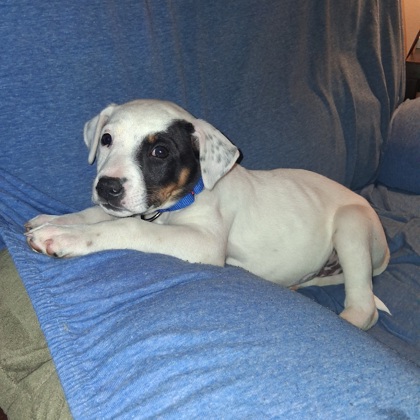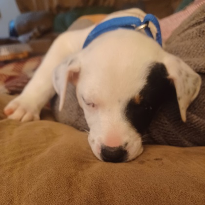 Marceline is a 2 month old little girl. She is the tiny one of the bunch but has so much personality. She loves some kisses and cuddles. Loves to play with her siblings, but won't be pushed around. She was a little fearful at first but, has settled in nicely. She has the sweetest little face and softest ears.