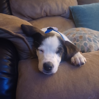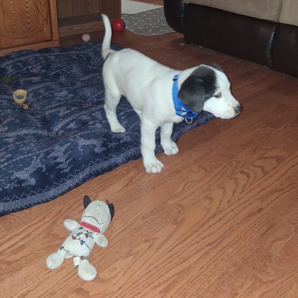 Jake is a 2 month old little boy who looks a little like Snoopy. He has the sweetest face and the softest fur. He is the adventurous one of the siblings. He loves to play and explore, but is a little fearful with the scary stairs! He has the cutest little play bow. In our home he is doing well with the crate.