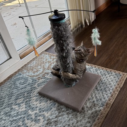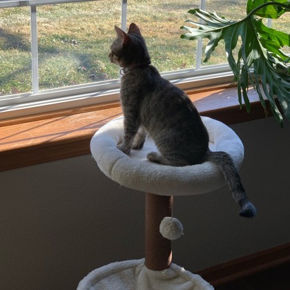 "Willow is 1 of 3 siblings being fostered together. They love playing, eating and sleeping with each other. The playful wrestling matches are epic...with Willow often being the ring leader!! Willow has lots of kitten energy for climbing up the cat tower, running through tunnels, and jumping around the furniture. Willow has fun running around the floor batting at and chasing toy mice, sparkly balls and spring toys. Willow is very inquisitive...always checking everything out. She will watch ("help") while her food is being prepared. If another kitten is getting snuggles and pets, Willow will wiggle her way in to get some too!"