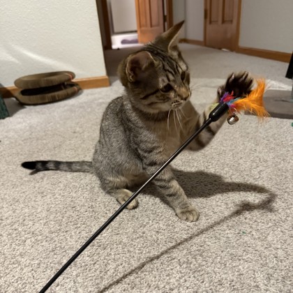"Theo is 1 of 3 siblings being fostered together. They love playing, eating and sleeping with each other. The playful wrestling matches are epic! Theo has lots of kitten energy for climbing up the cat tower, running through tunnels, and jumping around the furniture. Theo has fun running around the floor batting at and chasing toy mice, sparkly balls and spring toys. Theo is excited at meal time and will meow while his food is being prepared. He likes to be near and follow his human, and likes to sleep right next to his human. He shares happy purrs when snuggling and receiving pets."
