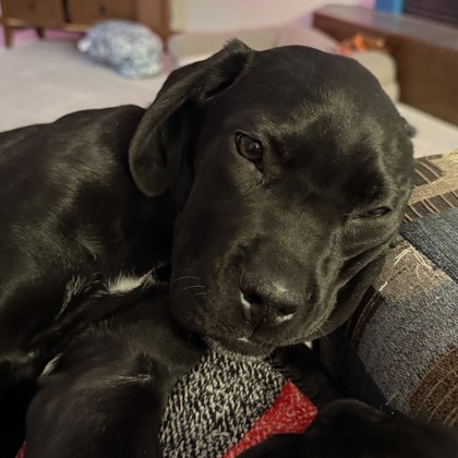 "Twin may not fit in your lap for long, but for now she'll happily squeeze herself in any chance she gets. This BIG, beautiful girl is all cuddles and wiggles. She's learning to play fetch, loves her toys, and is catching on to walks while leashed quickly.