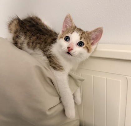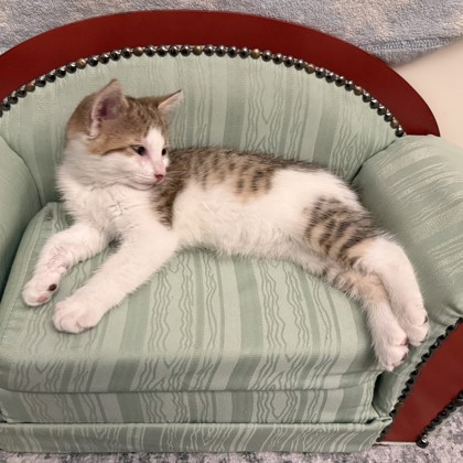 "Oliver is a sweet and playful little boy! His favorite activities include wrestling with his siblings and chasing toys, especially the cat dancer! Once he's all tuckered out from playing, he will curl up with his mom, siblings or foster mom to nap. He has the cutest little meow and purr! If looking for a pair, he would love to go home with one of his sisters, Hazel or Maple, but it is not a requirement. He would thrive with another kitty he can wrestle with!"