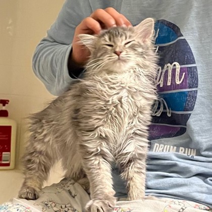 Brandon's foster parent says Brandon is an energetic, social, playful kitten. He loves being around people, and particularly enjoys exploring nooks and crannies. He loves chasing a ball toy, overseeing his kingdom from high places, and communicating with you through cute meows. He will make himself comfortable by climbing on your lap, snuggling with you in bed, and ocassionally stealing your pillow. He also loves to tussle and nap with his sister, Tosha!