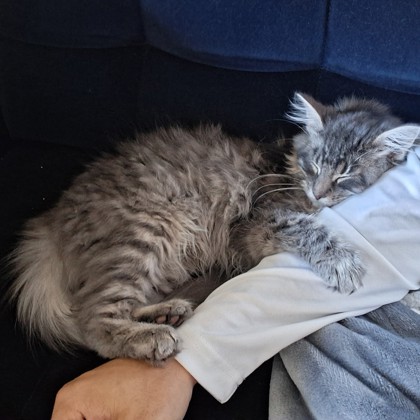 Tosha's foster parent says Tosha is a curious, sweet kitten who enjoys the little things in life. While you may need to earn her trust at first, once she knows you're safe she'll snuggle with you, purr loudly with pets, and follow you around the house. She enjoys crinkly toys and ball toys, head/neck scratches, and keeping you company while you work. She also loves playing with her brother, Brandon, who is also up for adoption! Not required to adopt together, but they do enjoy each other's company.