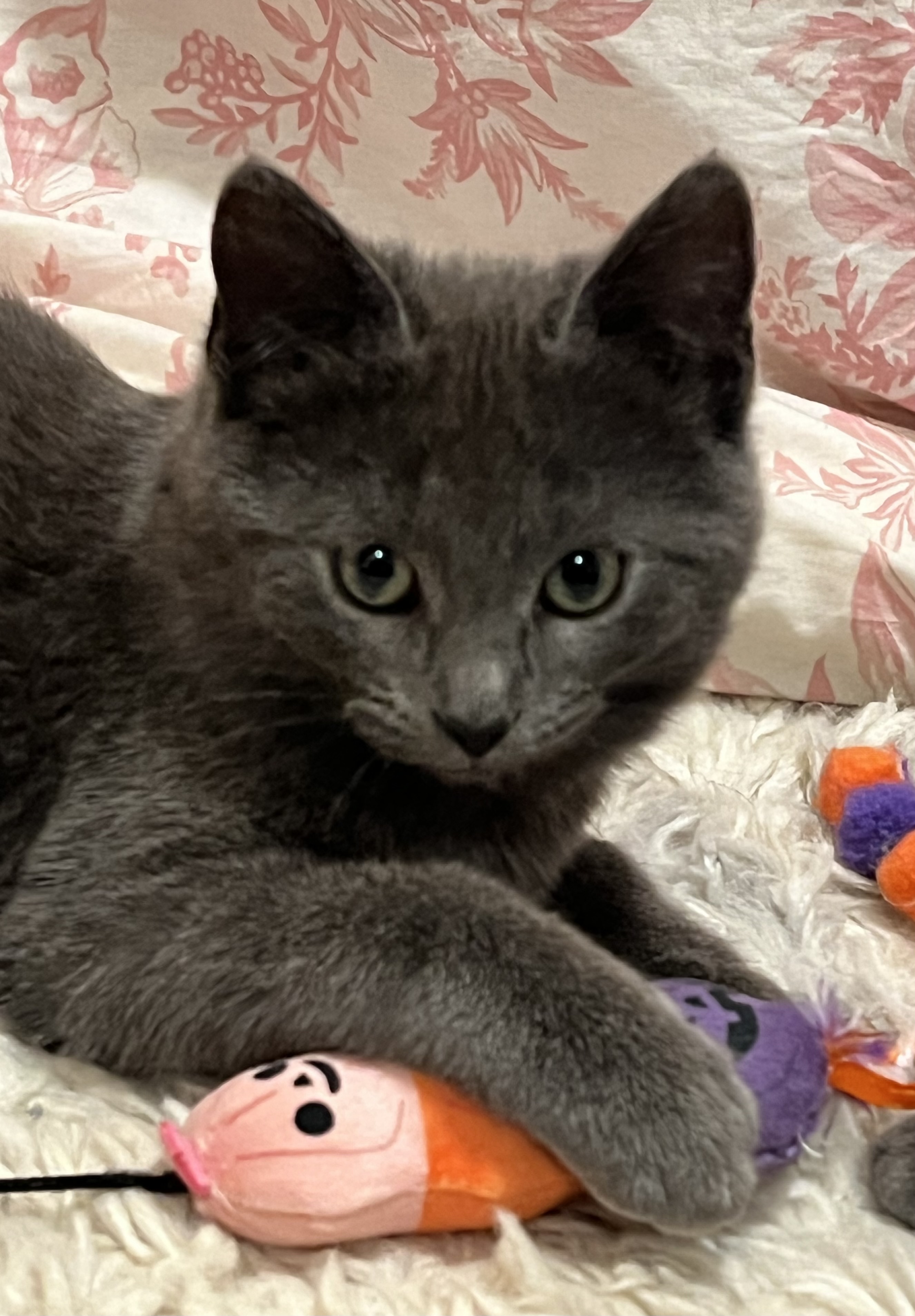 "Toast is a sweet boy who is really coming out of his shell and letting his playful personality shine through! He is a little shy and cautious at first, but if you show him a little patience, he quickly starts to feel comfortable as he gains your trust. He is being fostered with his bother French and he loves to play with and snuggle up with his brother for naps. His favorite toy is his wand toy! Once he gets to know you, if you show him a little patience he will reward you with his purrs and playful personality!"
