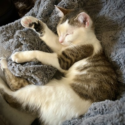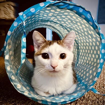 Blu's foster parent says Blu is curious, playful and easygoing. He has a "kitten at heart" personality-always ready to explore, chase a toy, or investigate whatever you're doing. Play with him, and you will be his best friend! Blu is very social and settles in quickly around people. Not a "hold me like a baby" cat, but he enjoys being near his humans-often curling up beside you on the couch or sleeping at the foot of the bed, accepting pets and following you around. What stands out most is his vibe: he's just... happy to be here. Curious, warm, slightly naive, and fully engaged with life! He is an absolutely adorable little "forever-kitten" size adventurer with a personality!