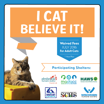 MILWAUKEE – A first-ever initiative in Southeastern Wisconsin aims to save the lives of nearly 1,000 cats in July. Shelters in five counties – the Wisconsin Humane Society’s (WHS) three locations, the Milwaukee Area Domestic Animal Control Commission (MADACC), Humane Animal Welfare Society (HAWS), Sheboygan County Humane Society, Washington County Humane Society and Elmbrook Humane Society have all agreed that in the month of July, all adoption fees for adult cats (1 year or older) will be entirely waived.