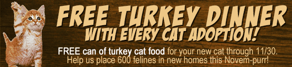 All cat and kitten adopters will go home with a free can of turkey-flavored cat food for their new companion, courtesy of General Pet Supply, and adoption fees for adult cats one year or older are entirely waived.