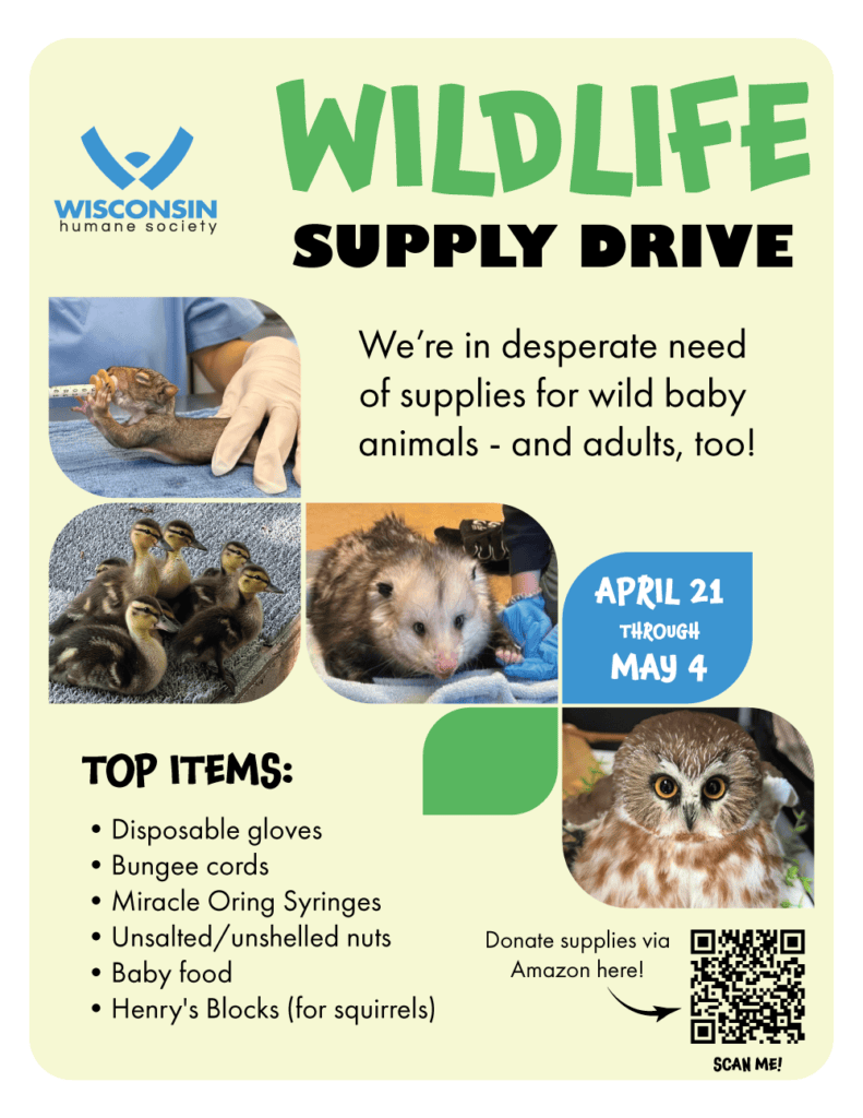 The Wisconsin Humane Society Wildlife Rehabilitation Center at our Milwaukee Campus serves thousands of wild animals and assists even more people by providing support to those who encounter wildlife in need.