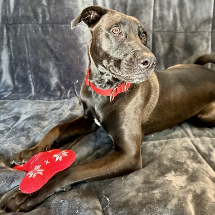 She has mastered the cues sit and kennel up! Stella loves to wrestle, get the zoomies in the backyard, play with toys, chew on bones, chase her tennis ball, and snuggle up in your lap on the couch. Stella will make a wonderful addition to a loving family with her goofy and sweet personality.