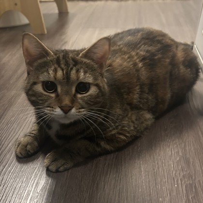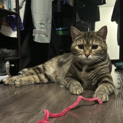 "Splinco is a beautiful cat who exhibits a lot of independence and enjoys her alone time. She tends to enjoy sleeping during the day and playing at night. She enjoys playing with any type of toy. However, her favorite are toys that are on a stick that she can chase. She enjoys being pet primarily on her head, behind her ears, and under her chin. Some quirks of hers include burying her food and water under towels and walking stealthily as she explores her environment. She is very good with the litter box and has no accidents. She is a bit anxious at first, but once she begins to warm up to her environment, she is able to open up and show her cute personality."