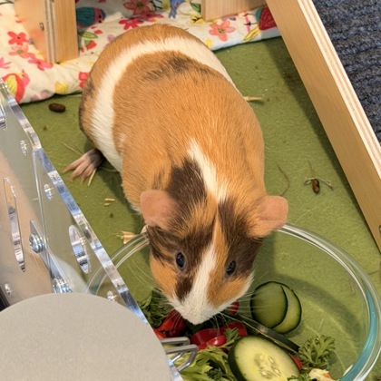 "Penelope is a very sweet, shy girl that is a perfect low-maintenance guinea pig. She spends most of her days lounging in her hidey, but will come out for salad time. She weaks and popcorns as you're preparing her salad, and will even take food from your hand. She gets along well with her cage-mate Valentina (also available for adoption). Please contact me with questions about this beautiful girl!"