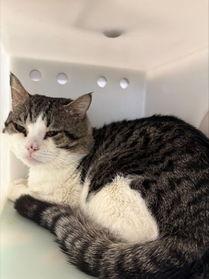 He's the kind of companion who prefers calm spaces, soft voices, and a predictable routine. Sudden movements and loud environments can make him nervous, so he's looking for a patient, understanding home where he can feel safe at his own pace. With time, consistency, and kindness, he'll begin to show his true self-whether that's quietly sitting nearby, accepting gentle pets, or simply relaxing in your presence.