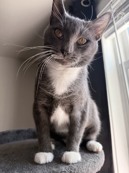 Cortex is a sweet, little girl with a white chest, gray coat and no-show white socks.