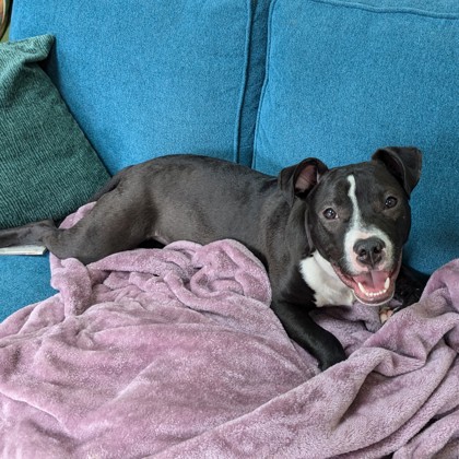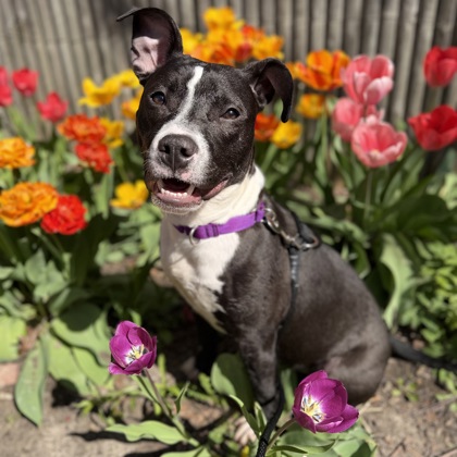 "R2Dog2 may be a little scared in the shelter but was so happy in our foster home. He is eager to please and loves treats and his snuffle mat. He can get nippy at times or try to play tug of war with his leash – but he really tries hard to be a good boy and loves a snuggle at the end of the day. He's still exploring the world where everything is new, so he appreciated short walks and long naps by himself. He is an independent sleeper at night and sleeps through the night no problem. Puppy is still working on potty training and learning how to sit, and he can't wait for a home to help him learn (and reward him with all the treats)!"