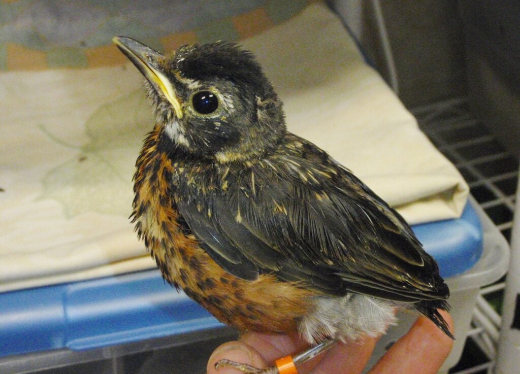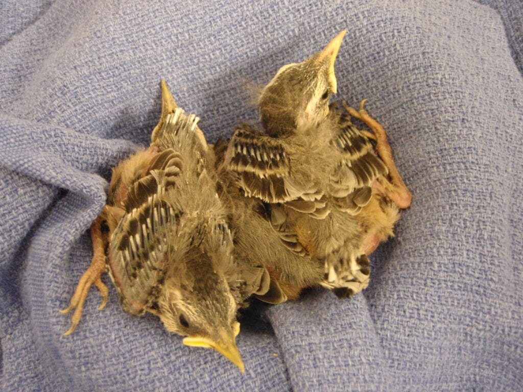 Nestling birds are naked or down-covered baby birds who are too young to be out of their nests. They sometimes fall from their nest or it’s blown down entirely, and they are found lying on the ground.