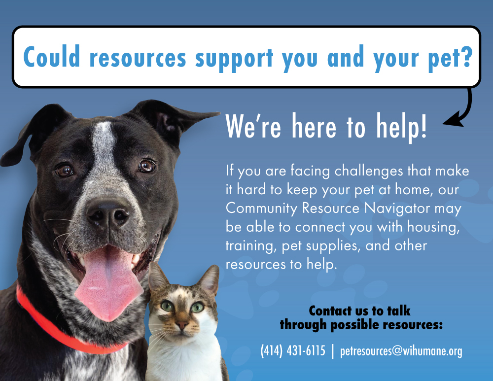 - Contact our Community Resource Navigator to talk through possible resources and alternatives to surrendering your pet at 414-431-6115 or petresources@wihumane.org