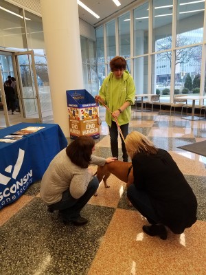What a fun event! The beautiful Tishman Speyer property on Kilbourne Avenue graciously hosted a WHS Cuddle Express event where their tenants were able to come and visit with WHS alumni animals. There was an outpouring of supporters coming to the lobby from those who work in the building for some animal interaction helped break up their Monday. After tallying everyone’s contributions in addition to a generous gift from Tishman Speyer, we were able to raise $1093.00 for homeless animals in the community over the lunch hour. Thank you to everyone who came out in support and hopefully the cuddles helped brighten your day!