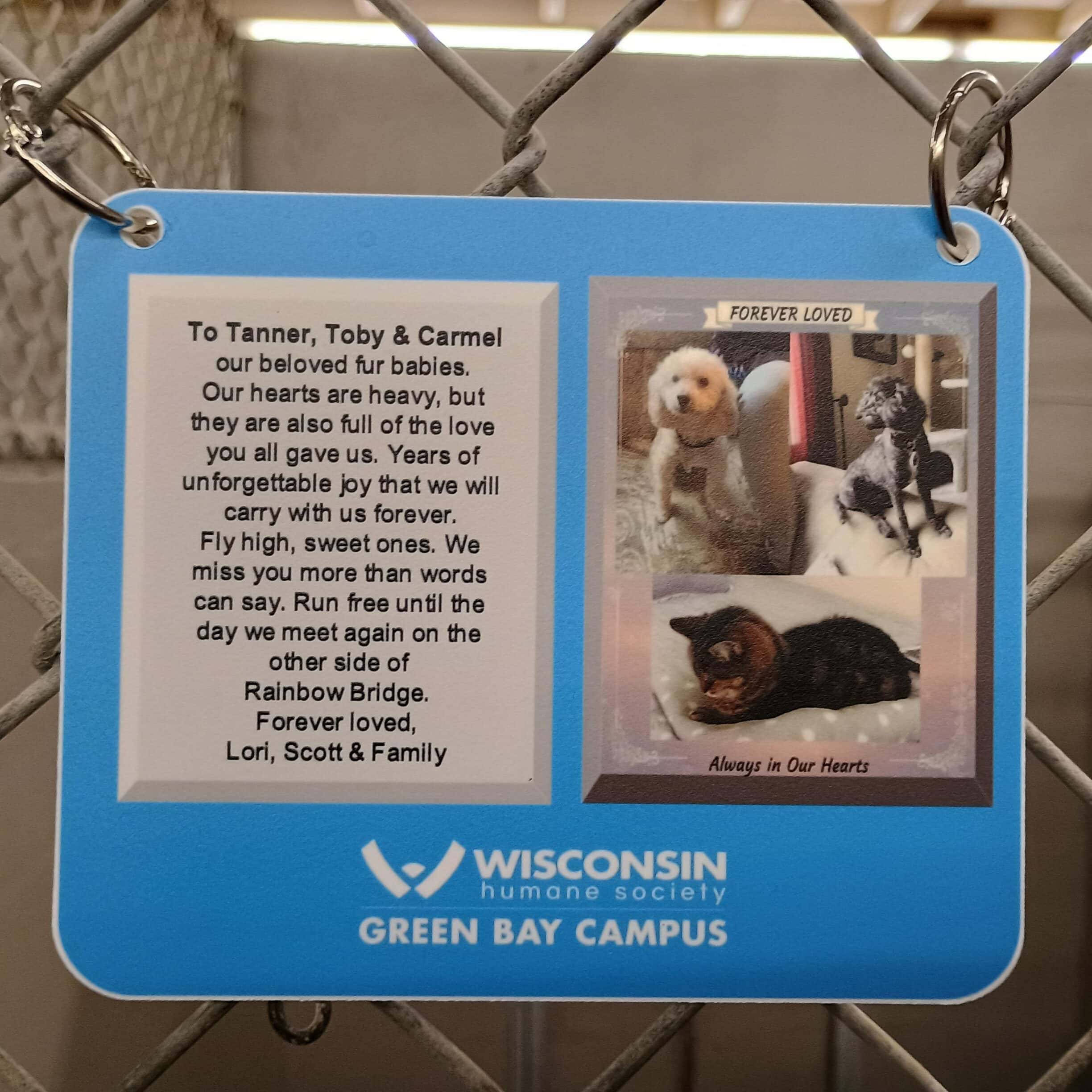 Celebrate your loved ones with commemorative signage on one of our dog or cat kennels at the WHS Green Bay Campus. These memorials also make a wonderful gift to celebrate a special anniversary, career milestone, a wedding, a new child or pet, or any life event for someone who knows just how much joy animals bring to our lives.